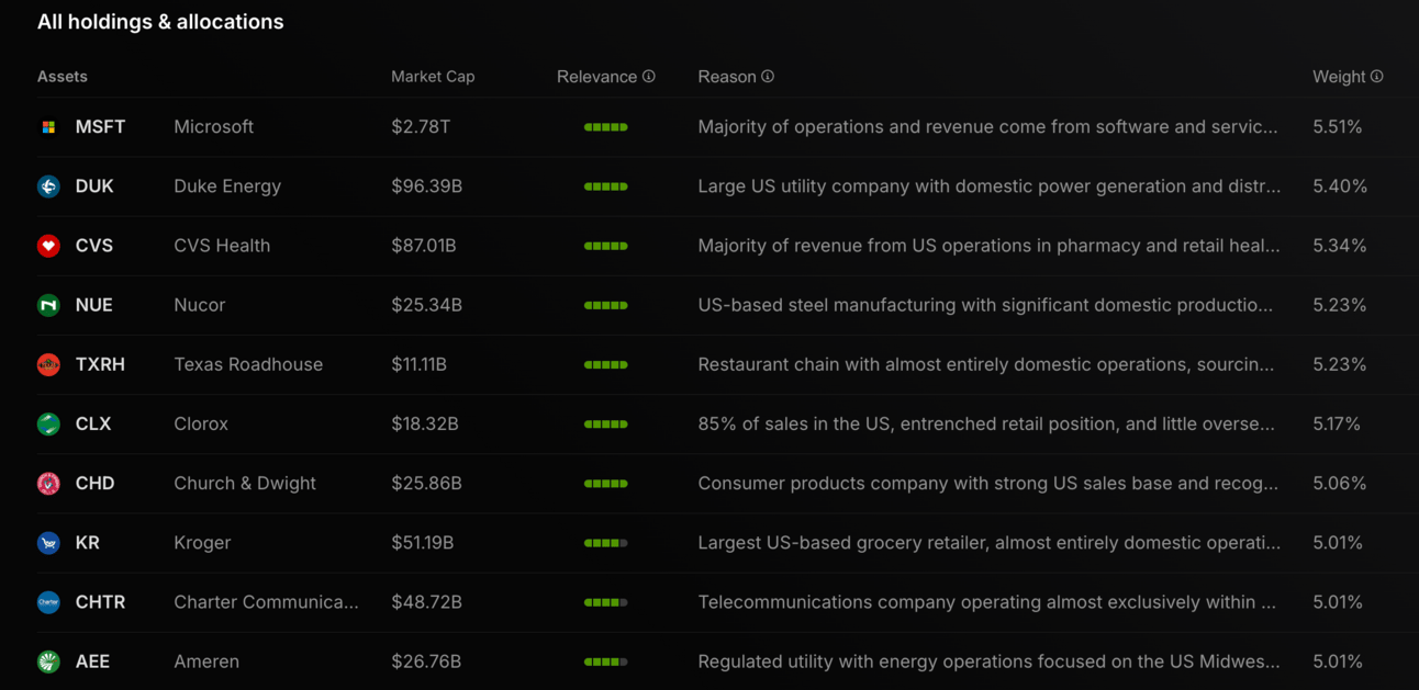 "A collection of companies that demonstrate resilience to tariffs and trade disputes due to their domestic focus, supply chain flexibility, pricing power, or ability to pass costs to consumers."